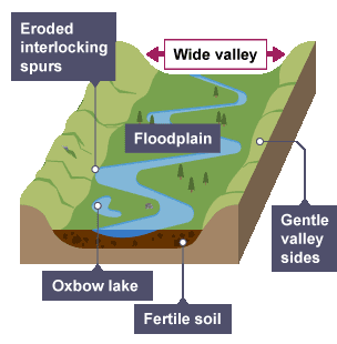 - Lateral Erosion: The sideward movement of a river erodes the banks, widening the floodplain.